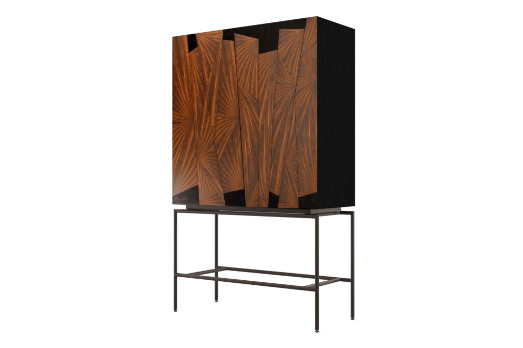 Frida è un omaggio alla forza creatrice della donna. Un luogo interiore, selvaggio ed incontaminato. Una giungla antropomorfizzata e scomposta in luci ed ombre. Mobile bar in frassino tinto, ebano e dettagli in ottone finitura oro rosa.