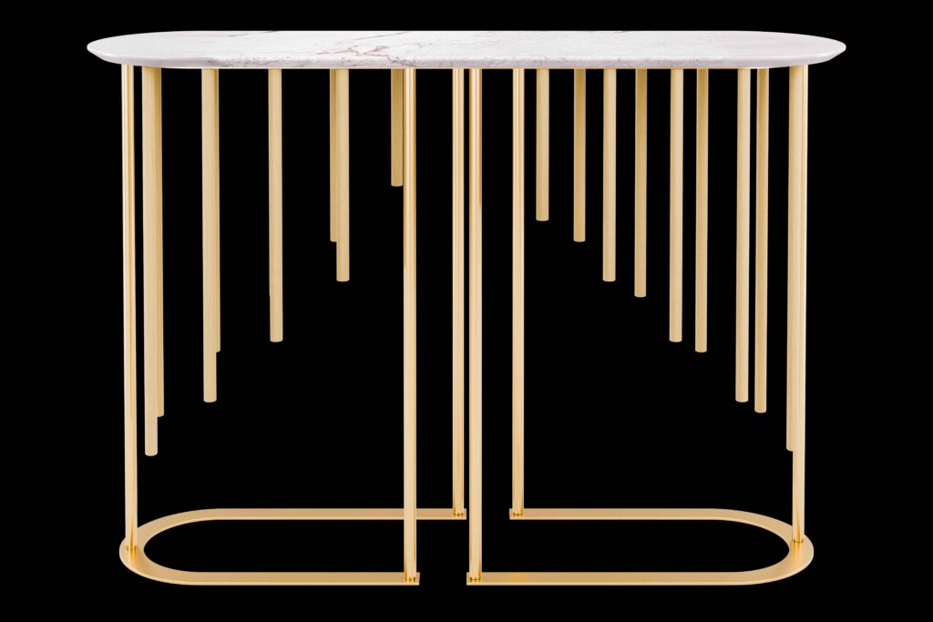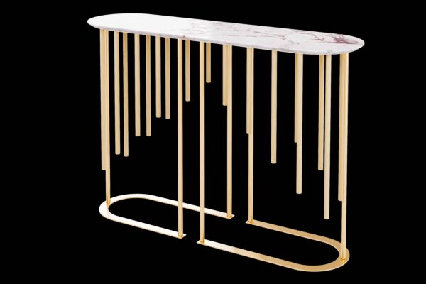 La collezione Giunchi è un omaggio alla naturale leggerezza delle canne giapponesi di Kumamoto. La consolle ha un basamento in legno in frassino con un audace e luminoso piano ellissoidale in marmo bianco Calacatta viola. Disponibile anche con basamento in frassino tinto, laccato RAL a scelta o in noce canaletto. Altri marmi a richiesta.